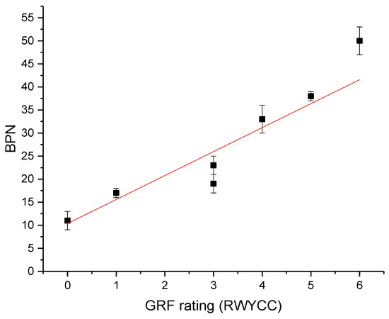 Firstly, the main winter conditions prescribed by the GRF were reproduced in the laboratory and the obtained BPN values were correlated with the RWYCC ratings. Since the RWYCC has been established as a function of the state of the runway, by taking into consideration the runway friction index (RFI), it is inherent that the results should correlate. These results are presented in Figure 5. The first condition is the dry condition, with a RWYCC of 6, while the evaluated BPN is as high as 50 ± 3, indicating that the surface skid is very low. Therefore, this can be considered the safest runway condition. This value is much lower than those available in the literature [24,25,27]. This is explained well by the difference between the surface’s macro- and microtexture. The pavement tested is less coarse than those used in other research [25,27].