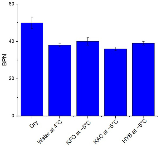 In order to deepen the analysis of this correlation, data were collected in different wet conditions which could be close to those encountered on the runway. Visually, the wet condition should also include the presence of liquid runway de-icing products in their initial concentration and also in their diluted concentration. So, in addition to the wet condition with water at 4 °C, data were collected when the concrete was wetted by KFO, KAC and HYB RDPs at −5 °C. It is not unusual for aircraft to encounter a runway completely wetted by RDPs. It is the case that when the RDP is applied in anti-icing mode, before precipitation, and also when RDPs melt the icy contaminants. The overall results are presented in the Table 1, as well as in Figure 6. As discussed above, the corresponding BPN to dry and wet with water conditions are 50 ± 3 and 38 ± 1, respectively. This slight decrease in BPN indicates that water acts as a lubricant. However, the BPN is not further decreased when RDPs are present on the concrete. KFO, KAC and HYB have a BPN of 40 ± 2, 36 ± 1 and 39 ± 1 respectively, all in the range of the wet-with-water conditions, indicating that they can be all treated as wet conditions.