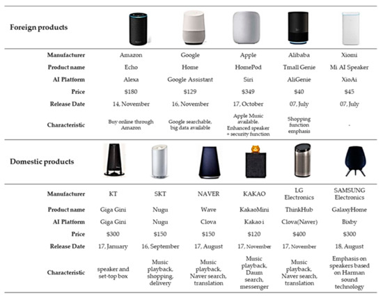 The oldest AI speakers are Xiomi’s Mi AI Speaker, released in July 2007, and Alibaba’s Tmall Genie. By 2022, 15 years have passed. In Korea, it is a product called Nugu developed by SKT, which was released in September 2016. After 2016, many telecommunication companies and home appliance manufacturers in Korea started to release artificial intelligence speakers. Its main functions are online shopping, listening to music, and searching. The most expensive AI speaker abroad is Apple’s Siri with a price of USD 349, and LG Electronics’ Naver Clova is the most expensive in Korea with a price of USD 400. The types of artificial intelligence speakers released on the market are as follows [3,4].