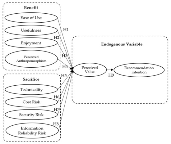Perceived value is a concept that asks if there is effort and savings in time and cost using artificial intelligence speakers. Through the anthropomorphism, intimacy, reliability, and perceived enjoyment provided by the AI speaker presented in CASA’s paradigm, we will check whether the user feels the value of saving time, money, and effort and satisfying the expected effect [28,29,30]. The purpose of this study is to find and suggest improvement factors that affect perceived values through causality analysis. Recommendation intention is possible when there is a positive perception of perceived value. The reason for the recommendation is the usefulness and convenience of information retrieval and the purchase of everyday products in non-face-to-face situations [30].