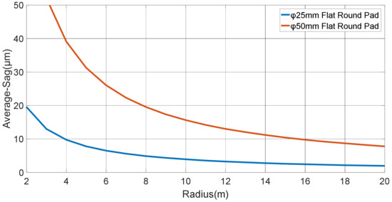 Figure 2 shows the relationship between the radius of curvature of the measured surface and the average sag for a Ø25 mm and a Ø50 mm pad (calculated by Formula (2)). In order to make the probe float on the surface, the flying height of the air-bearing should exceed the average sag, which means that the size of the pad is proportional to the surface’s radius. For most large aspherical mirrors, the asphericity is on the order of several hundred microns to several millimeters; thus, the sag difference between the center and outer edge of the mirror can be neglected for the pad with the appropriate size.