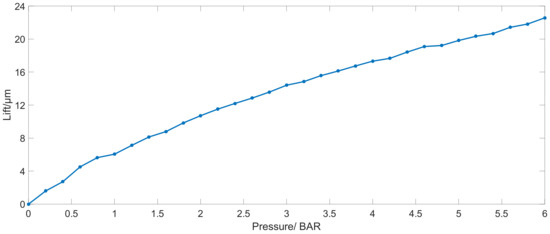 The air supply should be clean and regulated to constant pressure. Typical operating pressures range from 1 to 6 bar depending on the stiffness, load capacity, and air gap. Figure 4 shows the experiment result of the relationship between pressure and lift for a Ø25 mm pad with a 0.4 kg load, and the maximum repeatability of lift is 0.5 μm.