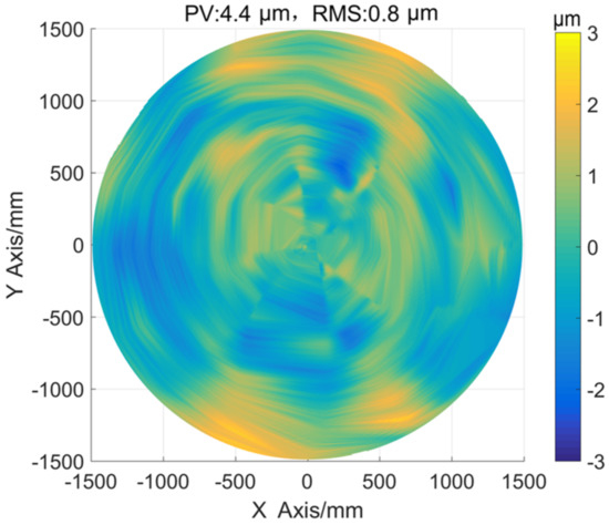 The preliminary data from this testing are quite encouraging; the optical measurement data (surface measured with interferometer and CGH) show that the mirror surface has 20 nm RMS figure error. The measurement result of the laser tracker is 4.4 μm in peak-to-valley (PV) and 0.8 μm in RMS, respectively, as shown in Figure 6, confirming that high precision of the non-contact scanning method in this geometry is achieved.