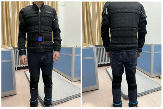 At present, most of the fall detection research uses the data obtained from young people imitating the movements of the elderly in a laboratory environment. However, the research shows that the acceleration amplitude of the elderly is much smaller than that of the young people during walking, mainly because the physical function of the elderly declines, and their movements are sluggish. Therefore, in the absence of real fall data of the elderly, subjects wear an elderly life simulation experience suit, equipped with wrist guards at the knees, elbows and wrists to restrict joint activities and sandbags tied at the feet and wrists to simulate the state of the elderly, such as clumsy body, stiff limbs and sluggish movements, to make the young people imitate the movements of the elderly more realistically in the laboratory environment and to avoid unnecessary injuries. The LPMS-B2 posture sensor is used in the experiment, and the equipment parameters are shown in Table 1.