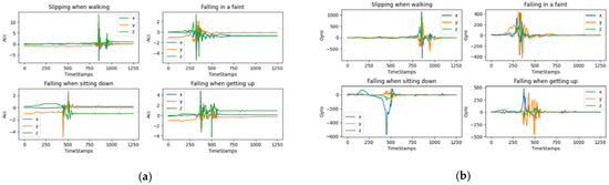 (a) Slipping when walking, falling in a faint, falling when sitting down and falling when getting up acceleration graphs; (b) slipping when walking, falling in a faint, falling when sitting down and falling when getting up angular velocity graphs.