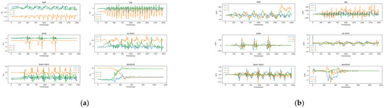 (a) Walking, jogging, jumping, going up stairs, going down stairs, sitting down acceleration graphs; (b) Walking, jogging, jumping, going up stairs, going down stairs, sitting down angular velocity graphs.