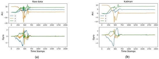 In view of the sensors being easily influenced by various factors, such as vibration, temperature and electromagnetic interference, which affects the final classification accuracy of human activities [35], Kalman filtering is introduced to process the data and eliminate noise before extracting the features of the collected acceleration and angular velocity data. The data before and after processing are shown in Figure 5. The main formulas of the Kalman filter are as follows:
