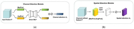 (a) Channel attention module in CBAM; (b) spatial attention module in CBAM.