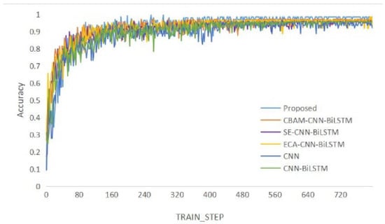 The comparison with the CNN, CNN-BiLSTM and the three most widely used attention mechanisms, namely, squeeze-and-excitation (SE), efficient channel attention (ECA) and the convolutional block attention module (CBAM), is made in this paper to verify the effectiveness of this research model and the improved effect. The training accuracy rate is shown in Figure 9.