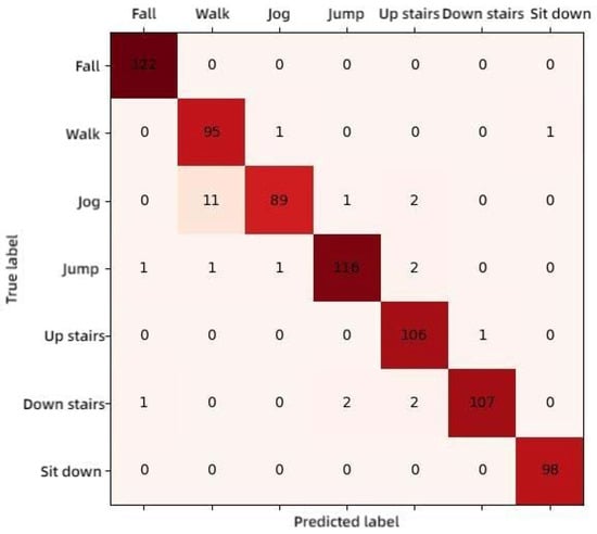 In this paper, seven types of movements are identified, including falling, walking, jogging, jumping, going up stairs, going down stairs and sitting down, and a total of 760 data sets are used for testing. The test results are shown in Table 7, and the confusion matrix is shown in Figure 10. The confusion matrix includes the number of samples with correct and wrong predictions for the seven movements in the test set. In the confusion matrix, the numerical values on the principal diagonal are the numbers of correctly predicted samples, while the numerical values at other positions are the numbers of incorrectly predicted samples. In the process of data collection, there are four types of falling movements, each of which also includes forward, backward and lateral falls. As shown in Table 7, the identification accuracy of falling movements is 99.74%, the sensitivity is 100%, and the specificity is 99.69%. As shown in Figure 10, one jump is identified incorrectly as falling, which may be due to the similarity in the forward/backward movement between jumping and falling and the large fluctuation in the Y-axis data. For daily behavior, the identification effect of sitting down is the best. During the experiment, the subjects wore the life simulation experience suit to imitate the elderly, which is intended to restrict their physical activities and result in a smaller movement range for jogging. Since the jogging movement is similar to walking behavior in their movement ranges due to physical restriction, the jogging behavior is predicted incorrectly as walking behavior in 11 groups. Through the analysis of the above experimental results, this model can effectively identify human falls and daily activities.