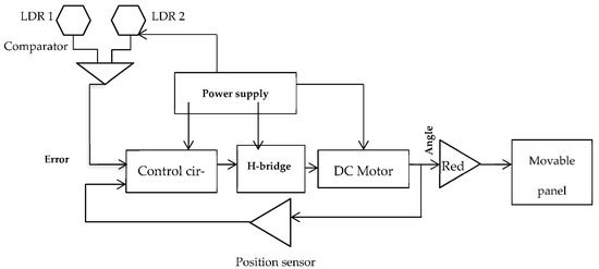The role of the operating or electronic block is to ensure that the solar radiation is always perpendicular to the panel. It, therefore, relies on systems allowing the reception of orders sent by the calculator, their conversion into electrical signals, their transmission to the articulated mechanical system, and the activation of the motor. As shown in the block diagram in Figure 1, when the tracking system steers the solar panels by rotating them in the direction of the sun and maintaining an ideal angle based on two light-dependent resistors (LDR) and a motor, the electrical power per square meter is maximized [20].