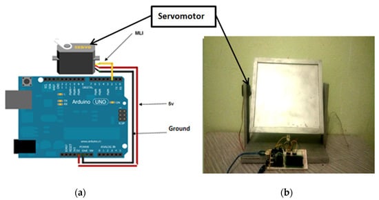 (a) Servo motor electrical diagram; (b) Position of the servo motor compared with the Arduino card.