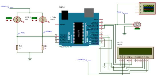 This part mainly includes components and electrical circuits to control our solar tracker system. The latter can be defined as a microprocessor-type information processing unit to which internal peripherals have been added, allowing the assembly to be carried out without the need for external components [21]. An Arduino board is a brand that covers hardware-free boards on which there is a microcontroller. Their free license allowed us to program microcontrollers that exist in the different cards as we wanted to analyze and produce electrical signals that can be used for different tasks, including the control and management of electronic processes and instruments [21]. Microcontrollers have reduced performance but are small in size and consume little power. Although the Arduino card was chosen because of its open-source architecture and the ease of connecting to the computer with a simple USB cable. This cable provides both the card power supply and serial communication [33,34,35]. The Arduino card is programmed via a software interface in pseudo-C language. Once the program has been written, it is sent to the card, which can then operate independently (without connection to the computer). To display the numerical or textual information produced by the Arduino card, we connected it to a computer on the one hand and to a liquid crystal display (LCD) on the other hand to be able to operate autonomously away from the computer. In our prototype, we used a display compatible with the Hitachi HD44780 driver.