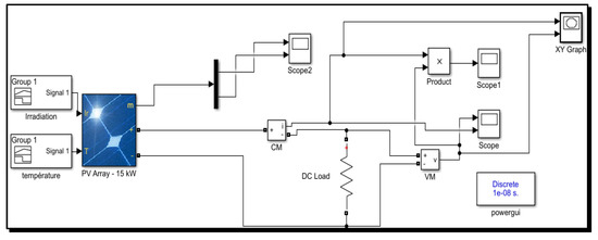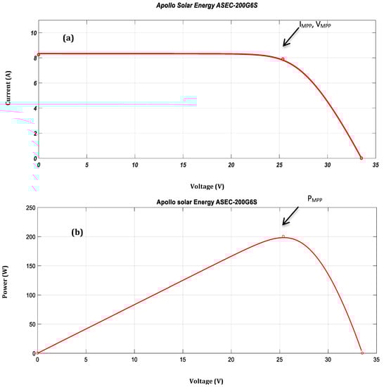 Current-voltage curve (I-V) and power-voltage curve (P-V) of the PV module (T = 25 °C, G = 1000 W/m2) exhibit a nonlinear relationship with the temperature and irradiance. However, on this characteristic curve (Figure 6a,b), there is a unique point where the entire system can work with maximum efficiency. This point is called the maximum power point M.P.P. It requires calculations, tracking, and control techniques to ensure the PV system is operating at this unique point to achieve the most incredible power harvest. Tracking of the maximum power point (MPPT) is a way to extract the maximum energy from the photovoltaic panels at different irradiance levels. Figure 6 shows the characteristic I-V and P-V of the PV module for a temperature T = 25 °C and a solar radiation G = 1000 W/m2. We found the short circuit current or the maximum current at zero voltage ISC = 8.24 A and the open circuit voltage or the maximum voltage at zero current VOC = 33.53 V. This result explains the 54 cells that make up the photovoltaic panel. The power delivered by the PV panels depends on the operating point of the generator. The max point represents the maximum power delivered by the generator (PMPP = IMPP*VMPP, where, VMPP s to the voltage to the maximum power supplied by PMPP, and the IMPP corresponds to the current to the maximum power supplied PMPP).