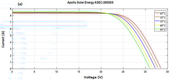 The temperature is a very important parameter in the operation of a PV module because of the temperature sensitivity of the electrical properties of the semiconductor. The characteristic I-V and P-V of a PV module according to the temperature under constant solar radiation (1000 W/m2) is represented in Figure 7a,b. We note that this characteristic I-V varies only slightly when the temperature varies, which means that the temperature has an effect over a long period of operation. It shows that the short-circuit current (I.S.C.) increases slightly with the temperature. It is thus observed that the influence of the temperature on (I.S.C.) and the maximum power current can be negligible and that the maximum power (PMPP) of the PV module undergoes a decrease when the temperature increases.