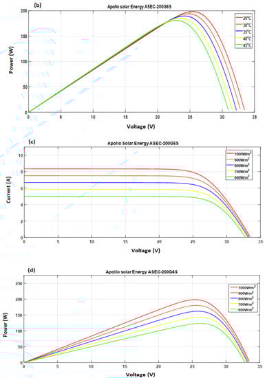 Figure 7c,d shows the I-V and P-V characteristics of the PV module for different irradiance levels by fixing the temperature value at 25 °C. We noticed that the I-V characteristics undergo a change with the irradiance and that the short-circuit current (I.S.C.) was directly proportional to the incident light intensity according to Equation (3). On the other hand, the increase in illumination causes a slight increase in the open-circuit voltage (V.O.C.). We deduced that the cell could provide an almost correct voltage, even in low light. This implies that the optimal power of the cell (Pmax) is practically proportional to the illumination, and the maximum power points are at approximately the same voltage.