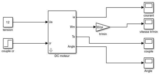The block diagram used in modeling the D.C. motor is shown in Figure 8. For our simulation, we have represented the equation system of a D.C. motor in this block diagram. The input parameters are the supply voltage (Ua) and the resistive torque (Cr). The accessible output parameters are the motor current (ia), the motor torque (Ce), and the rotation speed (Wm) by calculating the motor angle θ through integrating of the Wm.