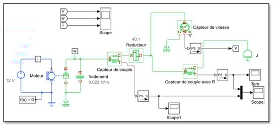 To facilitate the creation of our servo motor models in the Simulink environment, we used SimScape (physical systems simulation), which is an effective method for developing the mathematical model of the physical system by creating a multi-domain diagram based on physical connections. In addition, SimScape products allowed us to vary the system design without determining and implementing system-level equations. Figure 9 shows the block diagram we used in the SimScape simulation.