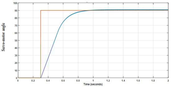 Figure 10 shows the simulation results of our servomotor, taking as input the set point (90°) and using the gains of the following P.I.D. controller: Kp = 100, Ki = 1, and Kd = 0 to drive the motor at the desired angle. The step response given in Figure 10 shows that the servomotor reaches its reference position at the angle of 90° for a response time that is less than 1 s. We have chosen a 12 v D.C. motor for our design. The parameters and the simulation results of this motor and the chopper, such as the temporal variation of the speed, current, and torque, the voltage at the chopper output, and the step response of a position-controlled servomotor, will be published soon in another article.