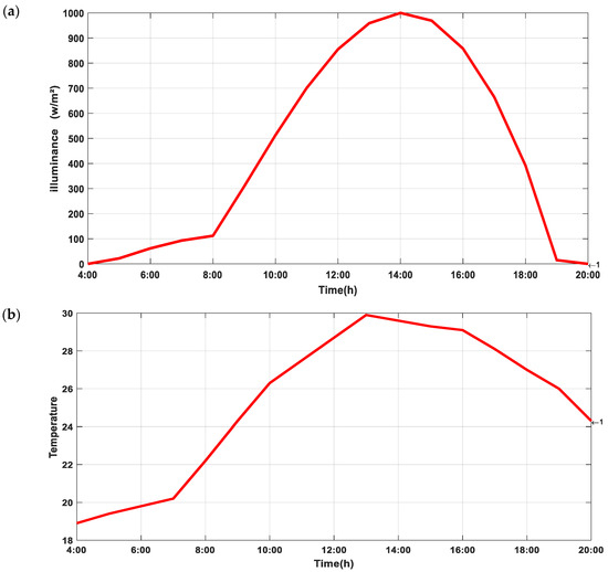 (a) Temporal variation of irradiance during a day. (b) Temporal variation of temperature during a day.