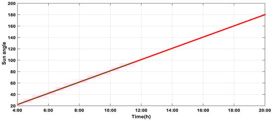 The temporal variation of different sun parameters like sun radiation, temperature, and sun angle θ are shown in Figure 11a,b and Figure 12. The simulation was carried out for 16 h from 4:00 a.m. to 8:00 p.m. in May. Where the value of the irradiance used in the study area during the days of the simulation was: