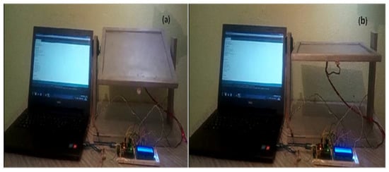 After receiving a quantity of light using a lamp, the prototype tracker starts tracking the solar radiation (Figure 13a). Figure 13b shows that the tracker is in the perpendicular position (90° almost at noon).