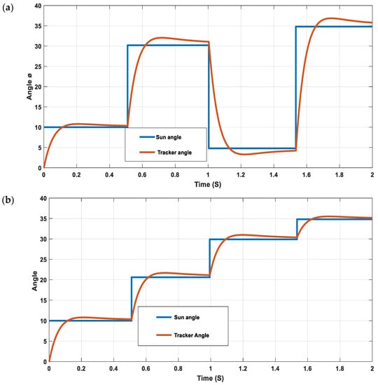 To validate our results, we performed two tests on the prototype of the single-axis solar tracker: the photovoltaic module connected to the prototype of the tracker and checking if it is in its fixed position. Figure 14a,b show the variation of the motor angle (Tracker angle) with respect to the sun angle for the two tests. It can be seen that the solar tracker reaches its reference position (sun angle) in a time of response of less than a second.