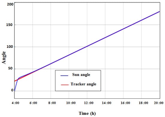 The position of the sun is given by the zenith angle (γs) and the azimuth (αs). The zenith angle is the angle between the local vertical and the line that connects the observer to the sun. The sun’s azimuth is the deviation of the sun’s position from the south. The zenith and azimuth depend on the local time of day (t), the day of the year (d), and the latitude (λ) of the observer (h) [4]. Figure 12 shows that the sun’s angle is equal to 90° almost at noon, so the tracker is perpendicular. At 180° at 8:00 p.m., the tracker is at a horizontal position and returns to its starting position.