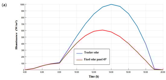 Figure 16a–d show the values variation of illuminance, voltage, current, and power of a PV module for two cases (with and without the tracker), which are compared for the period spanning from sunrise to sunset. When the curves are examined between 8:00 a.m. and 11:00 a.m., the voltage, current, and power values are a little close for the two cases. On the other hand, in the afternoon, between 12:00 p.m. and 7:00 a.m., we observed a large difference in the quantity of the voltage, current, and power produced. We concluded that a fixed panel’s energy loss was recorded from noon until sunset.