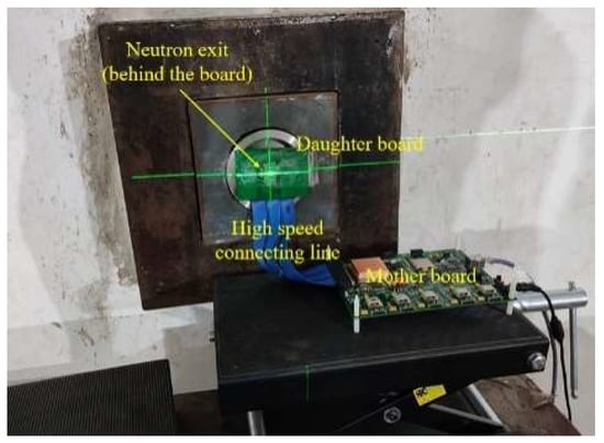 Figure 1 and Figure 2 show the irradiation experiment setup. The SEE testing system is designed using the motherboard—high-speed connecting line—daughterboard framework, to reduce the probability of a radiation induced abnormal motherboard. Prior to the irradiation, the checkerboard pattern had been inputted into the DUT. During the period of neutron bombardment, the contents in the DUT had been compared with the golden data at regular intervals. Detailed information on SEU, such as the error time, address and data, could be obtained in the irradiation experiment. Furthermore, the experimental temperature was maintained at 25 ± 5 °C, the SEL phenomenon did not appear and the currents were monitored during the whole test.