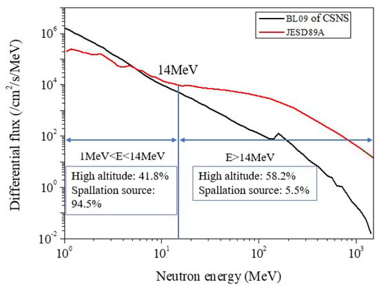 Neutron energy spectrums and distribution ratios of high-altitude and spallation source test. “JESD89A” denotes the energy spectrum of atmospheric neutrons in the JEDEC standard [13], which is the same as the neutron energy spectrum of the high-altitude test and includes the contributions from both galactic cosmic rays and solar wind.