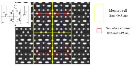 The 65 nm QDR SRAM simulation model (see Figure 7) has been built on the basis of the reverse-technique results of the DUT [10] and the experimental setup. The model includes six metallization layers and copper is the main metal material. Tungsten plugs are located between M0 and the active silicon layer. Table 3 shows the memory cell size and SV parameter of the 65 nm QDR SRAM. The drain of the OFF-state NMOS is regarded as the memory cells’ SV. The depth of the SV is set as 0.45 μm in consideration of the funnel length and diffusion process. Importantly, note that the DUT is very sensitive to the proton direct-ionization effect due to the low LET threshold, which is smaller than 0.5 MeV·cm2/mg.