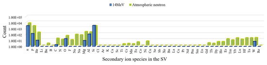 Figure 8 shows the 14 MeV neutron and atmospheric neutron-induced secondary ion species in the device SV. An obvious difference can be seen. The total yield of secondary ions generated by atmospheric neutrons is higher than that generated by 14 MeV neutrons. Additionally, it is important to note the logarithmic scale on the Y-axis in Figure 8; it is very clear that the main reaction products are n, p, Si, etc., of which protons are perfectly capable of leading to some soft errors in the QDR SRAM with a critical charge of 1fC (shown in Table 3). This reason may account for this phenomenon in Figure 3, which can be described as the 14 MeV neutron-induced SEU cross-section being lower.