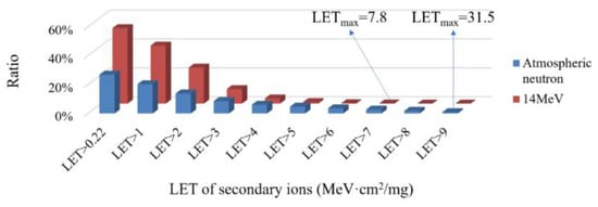 Figure 9 further shows the LET features of the secondary ions caused by 14 MeV and atmospheric neutrons in the SV of devices. First, under atmospheric neutron irradiation, the maximum LET of secondary ions in the device SV can be achieved at 31.5 MeV·cm2/mg. While the maximum LET decreases to 7.8 MeV·cm2/mg under the 14 MeV neutron irradiation. Second, as the LET increases, the overall ratio decreases rapidly under the 14 MeV neutron irradiation. These results suggest that the usage of 14 MeV neutrons may underestimate or even miss SEE types with high LETth, such as SEU in hardened devices.
