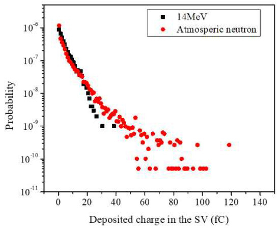 Figure 10 displays the characteristic of deposited charges, Qd, in the SV induced via 14 MeV and atmospheric neutrons. In the area of Qd < 17 fC, the deposited charge probability under the 14 MeV neutron irradiation is slightly higher than that under the atmospheric neutron irradiation. While in the area of Qd >17 fC, the apparent result of this is that atmospheric neutrons are capable of generating secondary ions with larger LET values, longer ranges, and thus more deposited charges in the device SV, with also higher probability. The secondary ion makes the maximum of the charge deposited reach 118.5 fC.