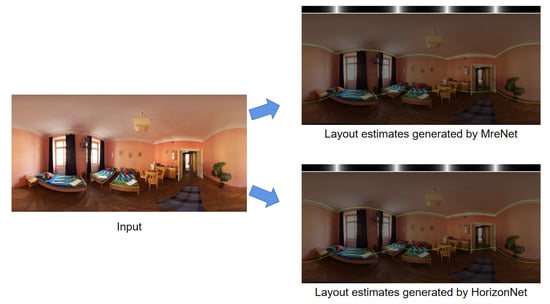 To test the actual effect of the reconstruction of a room layout, we took the best models obtained from MreNet and HorizonNet to estimate the layout of the panoramic image of the same rooms. The obtained layout estimation results are shown in Figure 6. It is obvious from the image that the layout estimation generated by the MreNet is more accurate in predicting the boundary of each plane, especially for the estimation of the location of the boundary between the ceiling and the wall.