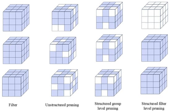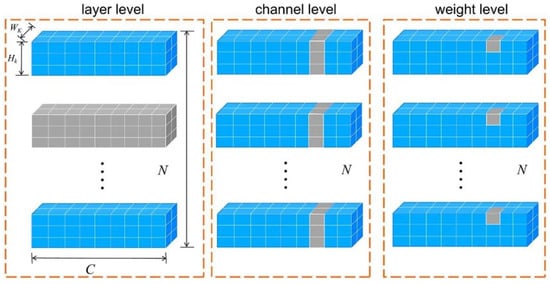 Structured pruning achieves simultaneous neural network compression and acceleration by directly deleting the structured convolutional neural network part and is well supported by various off-the-shelf deep learning libraries. At present, the main mainstream methods of structured pruning are the following four [37]: channel pruning, filter-level pruning, layer pruning, and connection pruning. A schematic representation of the model pruning section is shown in Figure 1. Channel pruning mainly reduces the number of redundant channels in the middle layer of the deep neural network model, aiming to optimize the computing and storage requirements of the model; filter-level pruning mainly removes the unimportant filters in the deep neural network model; layer pruning refers to the removal of some selected layers from the network model to reduce the volume of the deep neural network model. In addition, existing research attempts to delete the deep neural network model to reduce the parameter size of the network model.