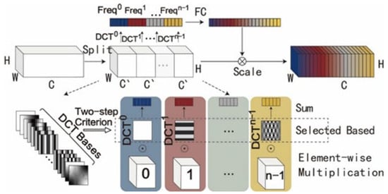 In order to integrate more frequency component information, including the lowest frequency component GAP, the multispectral channel attention module uses two-dimensional discrete cosine variables to operate. As can be seen from Figure 3, the specific execution steps are as follows: First, the input X is divided into n parts according to the channel dimension, which should be able to be divided by the number of channels. For each part, its corresponding two-dimensional discrete cosine variable frequency component is uniformly assigned, and its final output can be used as a preprocessing result of channel attention (e.g., GAP), as shown in Equation (2):