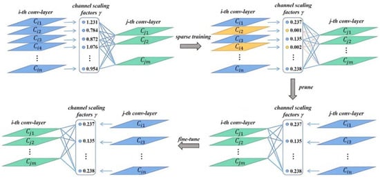 At the 2017 ICCV Conference in the Field of Computer Vision, Liu et al. [21] presented a paper proposing a pruning algorithm for pruning convolutional neural networks in a simple but rather efficient manner. For the VGGNet network model, the network- slimming and pruning algorithm reduced its model size by 20 times and the computational operation by 5 times, whereas the pruned network model did not significantly reduce the accuracy. Drawing on the idea of this network-slimming pruning algorithm, this paper designs a pruning algorithm for a lightweight object detection network, which has pruned the convolutional channels in the detection network and can be directly used for object detection networks based on the convolutional neural network. At the same time, the pruned resulting model does not require the use of specialized hardware or the underlying library and can be directly used for rapid detection tasks.
