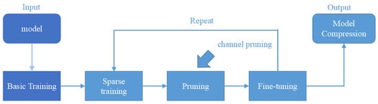 The flow of the channel pruning algorithm (The entire pruning process is divided into three steps: sparse training, pruning channel, and achieving accuracy recovery through fine-tuning).