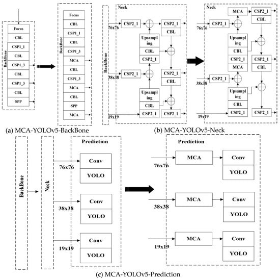 In Figure 7a, in the backbone network of YOLOv5s, the MCA attention module is fused to CSP1_3 (i.e., feature fusion); in Figure 7b, the MCA attention module is fused to the neck Concat layer of YOLOv5s and in Figure 7c, one MCA attention module is fused before the convolution of each prediction module of YOLOv5s.