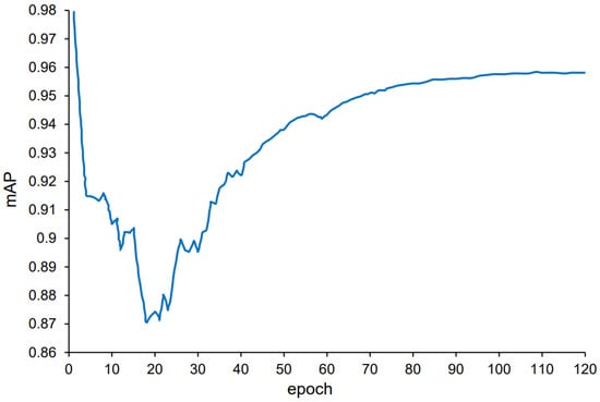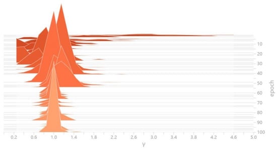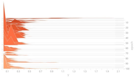 According to Figure 9, with the increasing training rounds during the model’s normal training period, the BN layer’s scaling factor converges from a scattered irregular distribution to a Gaussian distribution centered on 1. Figure 9 and Figure 10 show that the mean average accuracy of the network continuously decreases, and the values are continuously compressed in the first 20 rounds after the start of sparse training. Until the 20th epoch of sparse training, most of the values were compressed to near zero, at which point the mAP of the test set model drops to around 87%. After the 20th epoch, the mAP value of the network on the validation set gradually begins to slowly recover. Until the sparse training reaches the 110th epoch, the mAP converges to 95.8%, and the sparse training is completed when the compressed model mean average accuracy returns to the normal level. In sparse training, the weight distribution changes and mAP decreases, but after retraining, mAP will show an upward trend. After the model is fine-tuned, mAP will reach the optimal value. The scaling factor values are close to 0, meaning that the neural network convolutional channel has low importance to the entire model, so the channel can be cut off directly during pruning and does not have much impact on the mean average accuracy of the model.