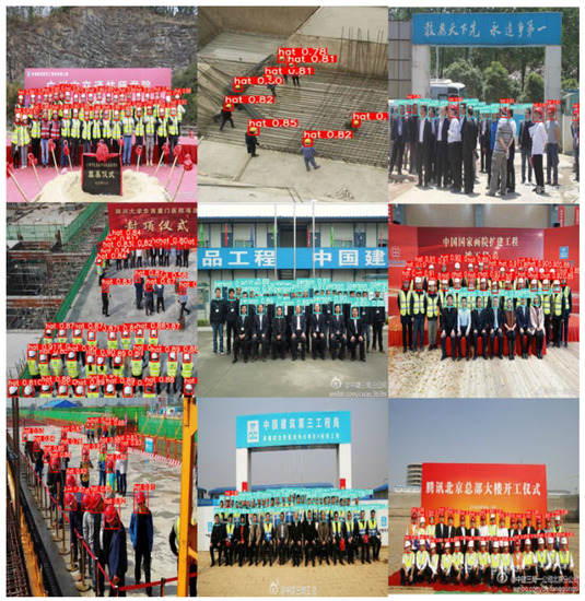 The partial detection results of the MCA-YOLOv5-Light safety helmet detection algorithm on the test sample set are shown in Figure 11. The red rectangular boxes represent the helmet-wearing situation detected by the model, and the blue boxes represent the head without a helmet. As can be seen from Figure 11, our detector can still more accurately detect whether a worker is wearing a helmet in a crowded situation.