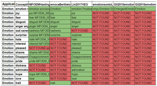 Ontologies are compared with each other to extract a common pattern to later generate a unified and federated emotional knowledge graph. As an example, we automatically retrieve key phrases (see Figure 3) if they mention emotion-related keywords such as: “fear”, “terror”, “anxiety”, “stress”, “stressed”, “despair”, “crying”, “anger”, “angry”, “irritation”, “joy”, “happy”, “happiness”, “pleasure”, “excited”, “calm”, “tired”, “bored”, “sad”, “disgust”, “love”, “surprise”, “hate”, “jealous”, “emotion”, “apraisal”, “guilt”, “sad”, “valence”, “face”. Since there is no corpus for such tasks, we have semi-manually built the gold dataset, as depicted in Figure 3. Each column corresponds to an ontology, and each row represents an emotion-related term.