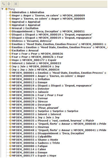 - Tabassum, H.; Ahmed, S. Emotion: An Ontology for Emotion Analysis. In Proceedings of the Conference on Emerging Trends and Innovations in Computing and Technology, Karachi, Pakistan, 15–16 December 2016. [Google Scholar]