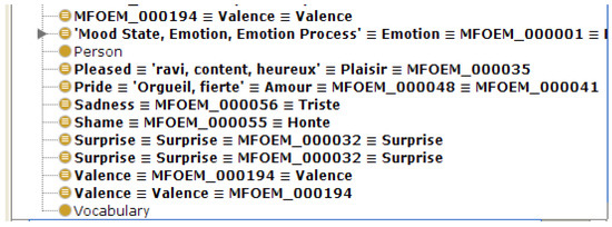 Emotion Ontology (EMO) (Hastings et al. [22]) describes types of emotion for the affective science domain. EMO is aligned with Basic Formal Ontology (BFO) and the Ontology of Mental Disease (OMD). Mental health and disease ontologies (MFOEM) (Hastings et al. [48]) provides a taxonomy of emotions. Affective science, psychology, and the psychiatric domains are interconnected with the Mental Functioning Ontology (MF) (Larsen, Hastings et al. [23]), which describes concepts such as consciousness, perception, thinking, and believing. Within their state of the art [23]), only few ontologies are mentioned, such as Gene Ontology (GO) and Hastings’s ontology [48]. For this reason, we deeply investigated ontology-based emotion projects (see Table 1).