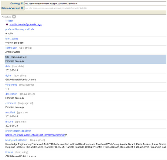 Emotion-aware applications is based on an ontology describing emotions (Lopez et al. [27]), their detection, and expression systems. The ontology reuses DOLCE (http://www.loa.istc.cnr.it/dolce/overview.html, accessed on 17 September 2022) and FrameNet (https://framenet.icsi.berkeley.edu/fndrupal/, accessed on 17 September 2022) to model descriptions and situations.