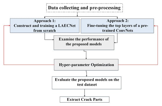Previous works have recommended original ConvNets constructed from scratch and trained to localize or sort defects or cracks in images. Training a new network is typically a costly practice that frequently checks and examines various ConvNet algorithms and tunes several parameters to optimize performance. Thus, transfer learning (TL) of a pre-trained deep learning (DL) architecture on standard datasets for new baseline classification tasks has been implemented. Ref. [16] proposed an image-based approach using TL to detect concrete cracks, Ref. [17] proposed a DL-based transfer learning approach to detect cracks in ceramic plates, Ref. [18] proposed a DL-based approach to detect defects in tire X-ray images, and so on.