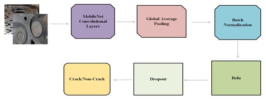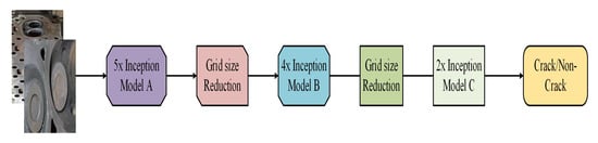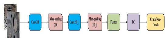 Automotive component cracking is a common phenomenon in the mechanical components of an engine and has a significant impact on the structural firmness of engine parts, engine fuel consumption, and environmental pollution. Cracking is one of the signs of deficits in engine components, which can have many cases, such as mechanical stresses, wear mechanisms, overheating, and lubrication mechanisms. Manual crack checking and the inspection of automotive engine components is performed on a regular basis by trained and experienced machinists and mechanics who use a spray, a magnifying glass, and a magnetic particle inspection method [1,2,3], and this process is labor-intensive and time-consuming. Moreover, inspection outcomes rely immensely on human bias and subjective judgment, leading to inaccuracy and in some faults being overlooked.