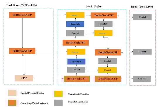 In the YOLOv5 algorithm, an input image size of was fed into the model. Subsequently, in the focus slice task, the feature maps with were transformed, followed by the regular convolution operation of 32 convolution size kernels. Finally, it was transformed into a feature map size of with the CSP structure in the backbone network. Due to the advantages of this network, several studies have been conducted in various areas, such as in safety helmet detection [46], face mask detection [47], infrared image detection [48], the detection of mold on food surfaces [49], the detection of heavy-goods vehicles [50], and densely-populated traffic detection [51]. The architecture of YOLOv5s is depicted in Figure 6.